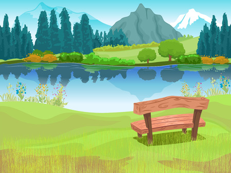 山の麓にある湖のほとりに座っているベンチのイラスト の写真素材 画像素材 Image